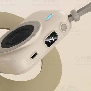 Power Bank compacto com design de minicâmera, capacidade de 10.000mAh, carregamento rápido de até 22.5W, entrada Tipo-C, duas saídas (Lightning e Tipo-C), proteção de múltiplos circuitos, visor LED indicador e chip de reconhecimento de tensão inteligente.Tipo