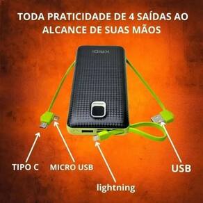 Power Bank Kaidi KNC-8882 20000 Carregador Portátil 8882 - 955 Power Bank 20000 mAh - Kaidi Modelo KNC8882 é a solução definitiva para suas necessidades de energia móvel. Com uma capacidade poderosa, este Power Bank fornece energia confiável para uma ampla gama de dispositivos, incluindo celulares, smartphones, tablets, caixas de som, notebooks, fones de ouvido e muito mais. Nunca mais se preocupe em ficar sem bateria quando mais precisar. Uma característica notável deste Power Bank é o indicador de porcentagem de bateria integrado, que permite que você acompanhe facilmente a quantidade de energia restante. Dessa forma, você sempre terá uma visão clara do nível de carga disponível e poderá planejar suas recargas com antecedência. Além disso, o Power Bank é acompanhado por cabos versáteis que incluem conexões Lightning, V8 e tipo C, proporcionando compatibilidade com uma ampla variedade de dispositivos. Não importa qual seja o seu dispositivo, este Power Bank oferece a solução perfeita para mantê-lo alimentado e pronto para uso. Desperte a necessidade de praticidade, conveniência e liberdade em sua vida. Com o Power Bank 20000 mAh, você nunca mais ficará preso a uma tomada ou se preocupará com a duração da bateria do seu dispositivo. Esteja sempre conectado, produtivo e pronto para aproveitar ao máximo seus dispositivos eletrônicos. Adquira o Power Bank e desfrute da energia ilimitada onde quer que esteja. ESPECIFICAÇÕES TÉCNICAS: - Funciona para , Android, Qualquer Aparelho; - Com Cabos Inclusos, Conexão por Cabo para , Lightning, V8, e Tipo C; - Possui Entrada Usb fêmea para usar o próprio Cabo de seus Aparelho, caso deseje; - Bateria potente, aguenta Aproximadamente 5.000 horas; - Suporta Aproximadamente de 4 a 6 cargas; - Pode usar em 2 Aparelhos Simultaneamente; - Capacidade: 20.000mah 3.7V 74Wh; - Entradas: DC5V 3.1A Max; - Saídas: DC5V 3.1A Max; - Temperatura em Trabalho: 0C to 40C; - Peso: 409g; - Comprimento: 2.5cm; - Largura: 7.0cm; - Altura: 14.5cm. Smart New Tech - PB-8882-PRETO Anatel 089652315167