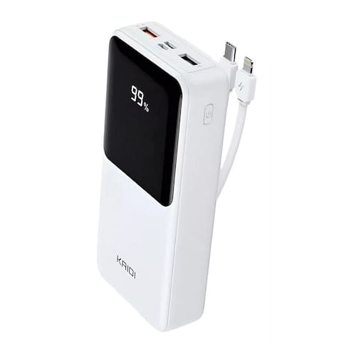Capacidade de 20.000mAh, Carregamento turbo de alta velocidade (22.5W / 20W PD), Visor digital LED inteligente, Cabos incorporados Tipo C e Lightning (iOS), 2 entradas USB adicionais, Homologado pela Anatel.Tipo
