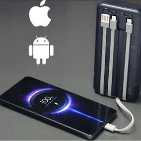 Conexões versáteis: 1 saída USB, 1 saída USB-C e 4 cabos embutidos: Micro USB, Lightning, USB-C e cabo de alimentação USB.