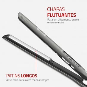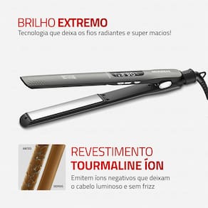 Características: Modelo: P-25 Linha: Tourmaline Íon Tipo de Prancha: CERÂMICA COM TOURMALINE ÍON Cor: Grafite Brilho Extremo: A tecnologia do Tourmaline Íon deixa os fios radiantes e super macios Painel digital com Controle de Temperatura: Ajustes de 100°C a 230°C para um acabamento perfeito em todos os tipos de cabelo Aquecimento Rápido: Atinge a temperatura máxima em menos de 1 minuto Chapas Flutuantes: Deslizam suavemente para um alisamento uniforme e sem marcas Patins Longos: As placas de alisamento são mais compridas e permitem alisar maior quantidade de cabelo de uma só vez Bivolt: Compatível com 127V e 220V Pode ser utilizado em todos os tipos de cabelos