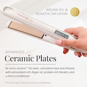 — Placas de cerâmica avançadas: mergulhe em uma experiência de estilo superior com 9 vezes mais cerâmica do que os modelos Remington padrão. Enriquecido com óleo de argão rico em antioxidantes, queratina rica em proteínas e um microcondicionador mágico para um calor consistente e uniforme.