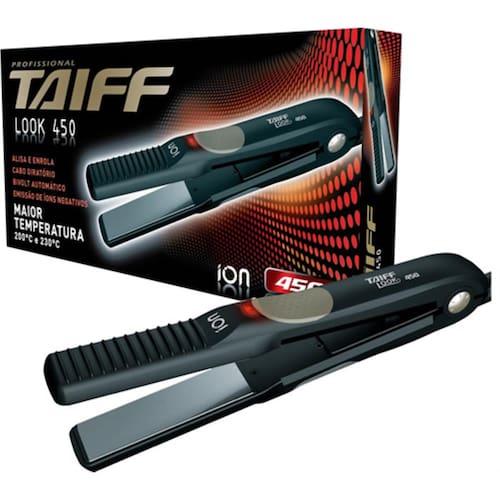 Chapinha ( prancha) Taiff Look 450 Bivolt A Chapa Look 450 da Taiff alisa com eficiência, além de manter a cor e o brilho dos fios. Possui sistema de suspensão com placas autorreguláveis e Duall transmission que repõe o calor rapidamente com a temperatura constante sem alterações. Alisa, faz cachos e sela as cutículas dos cabelos sem danificá-los. Agora você vai ficar mais bonita com madeixas lisas e bem cuidadas. Imagens Meramente Ilustrativas.