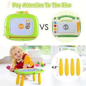 Quais habilidades as crianças podem aprender brincando com pranchetas magnéticas? Imaginação e criatividade As atividades criativas proporcionam às crianças imensa alegria e promovem a curiosidade e a resolução de problemas. Ao incentivar nossos filhos a brincar, explorar o ambiente e usar a imaginação, estamos plantando as sementes para o pensamento criativo e as habilidades de resolução de problemas. Habilidades motoras finas Com placas magnéticas, especialmente aquelas que vêm com lápis, são uma boa maneira de incentivar as crianças a usarem as mãos para criar algo incrível e legal. Sempre que uma criança usa as mãos e os dedos para brincar, ela está praticando e refinando suas habilidades motoras finas e a coordenação olho-mão. Habilidades de comunicação e linguagem Os quadros magnéticos incentivam as crianças a se envolverem em histórias criativas. Os blocos de desenho vêm com carimbos que eles podem usar para contar histórias com base em sua experiência ou em algo completamente novo de sua imaginação. Habilidades emocionais e sociais Quando as crianças brincam com placas magnéticas, elas podem se envolver em brincadeiras imaginativas e fingir. E enquanto jogam, eles podem experimentar emoções diferentes e terão a chance de ver as coisas em perspectivas diferentes. Ser capaz de contar histórias também ajuda a aumentar a confiança e a autoestima da criança. Pacote: 1 bloco de desenho, 4 pernas, 1 caneta — 🎀 1 presente para meninas de 2 anos: não é apenas um belo presente de Natal, presente de aniversário, presente de Natal, presentes de festivais, presente de visita para meninas, mas uma forma relativamente barata de oferecer a seu filho infinitas horas de oportunidades artísticas e educacionais. Use pranchetas magnéticas para matemática, reconhecimento de números, aprendizado de formas e até mesmo para fazer o dever de casa. - 🎨 Zonas de cores vermelho/azul/verde/amarelo: o quadro magnético de rabiscos para crianças de 1 a 3 anos exibe 4 cores diferentes que tornam o desenho infantil mais vívido. Com um doodle pad de 9,8", os brinquedos para meninas podem ser utilizados repetidamente. Sua filha de um ano pode facilmente puxar o escorregador para frente e para trás, então ele ficará limpo imediatamente. - 💪 Segurança e rolamento forte: a prancheta para crianças é feita de material ABS de alta qualidade, não tóxico e insípido, e passou no teste de segurança para brinquedos para bebês por mais de 12 meses, proporcionando às suas meninas uma infância segura e feliz. Até 120 libras. Não precisa se preocupar em tremer ou quebrar. - 🖍? Design suave e sem asfixia: não há peças pequenas sufocantes na embalagem para meninas de 18 meses ou mais. Design de borda fluida para evitar ferimentos nas mãos de uma menina de 1 ano. O design da caneta e da corda é integrado, não precisa se preocupar com a perda repentina da caneta. Comprimento de corda suficiente para permitir que a mão direita ou esquerda desenhe livremente. - 🎁 Brinquedos de viagem convenientes: as 4 pernas da mesa de desenho podem ser destacáveis e alteradas de formato de 3 maneiras. Deixe as crianças desenharem com mais liberdade e conforto. O design da alça é conveniente para transportar em viagens de carro, trem, barco e avião. Meninas de 1 a 3 anos não vão bagunçar o tapete da vovó da mesma forma que as tintas.