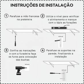 Instruções de Montagem: Posicione O. Produto na Parede, E. Marque Com um Lápis O. Local Onde Estão os Furos Das Prateleiras. Com Uma Furadeira, Faça os Furos Nos Locais Marcados E. Insira A. Bucha E. Suporte de Embutir Que Acompanham O. Produto. Então Encaixe A. Prateleira ou Nicho.