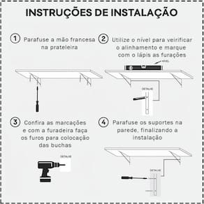 Instruções de Montagem: Posicione O. Produto na Parede, E. Marque Com um Lápis O. Local Onde Estão os Furos Das Prateleiras. Com Uma Furadeira, Faça os Furos Nos Locais Marcados E. Insira A. Bucha E. Suporte de Embutir Que Acompanham O. Produto. Então Encaixe A. Prateleira ou Nicho.