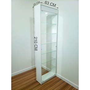 Comprimento: 63 cm Altura: 210 cm Profundidade: 25 cm Distância Entre as Prateleiras: 28 cm Número de Prateleiras: 6 prateleiras removíveis em vidro temperado, proporcionando flexibilidade na organização.