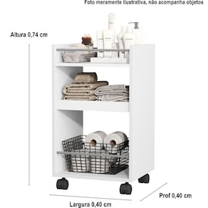 Prateleira armário banheiro multiuso organizador rodizio nova cor branco - comprar moveis para sua casa Prateleira multiuso amon, criada para inovar na organização do seu ambiente. Produto exclusivo comprar móveis em casa para deixar seu ambiente mais bonito e sofisticado procure nossas redes sociais e confira todos nossos produtos e qualidade de atendimento : Produto com video de montagem no nosso canal, acesse nossas redes sociais: comprar móveis em casa Dimensões do produto montado Altura: 0,74 cm largura: 0,40 cm profundidade: 0,40 cm Caractersticas: Mdp 12mm 4 rodizios 4 hastes plasticas Produto não acompanha cesta e objetos, foto meramente ilustrativa Montagem: Este produto acompanha kit de montagem + manual de instrução detalhando passo a passo de como montar. A montagem do produto deverá ser feita por um , para que não ocorram danos no produto. não nos responsabilizamos por erro de montagem Atenção: a montagem não é oferecida pela comprar móveis em casa, a montagem do produto é por conta do comprador. Observações importantes: A é de 90 dias por defeitos de fabricação. Se no ato de recebimento do produto o cliente verificar que o produto não está em prefeito estado, principalmente por ocasião de transporte irregular, o cliente deverá recusar o recebimento do produto e entrar em contato para resolver o problema. Podem haver variações referentes à tonalidade das cores expressas nas fotos, por conta de fatores como iluminação e brilho de cada monitor/celular. Fotos meramente ilustrativas, não acompanham os produtos de decoração. Atenção, se atente a politica de troca/devolução da empresa. Marca: Não Informado Ean: 7794038719210