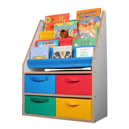 Itens inclusos: Estrutura em madeira + 4 bolsos de tecido + 4 Caixas 28x15x28 coloridas em TNT estruturado.