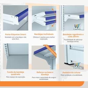 Montagem fácil por sistema de encaixe, sem uso de parafusos, inclinação da bandeja em 3 posições e fundo quadrado para melhor exposição. Possui bandejas reguláveis na coluna a cada 25mm, o que permite adição de bandejas extras.Ponteira de coluna para proteção e durabilidade, porta etiquetas smart, que não solta fácil.