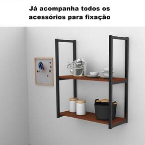 Características gerais: Cor: Suporte Preto e Prateleiras Avelã Local de instalação: Parede Peso: 4,43Kg Capacidade de carga por prateleira: 20 kg Material suporte: Aço carbono com pintura eletrostática Material prateleira: MDP Prateleiras pintadas com proteção UV