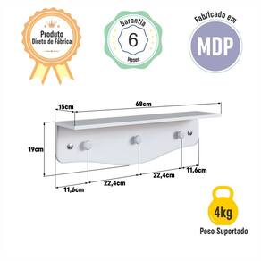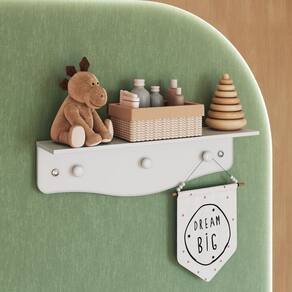 A Prateleira Infantil com Cabideiro Linha Encanto da Completa Móveis é versátil, prática e elegante, com características que a destacam. Ideal para o quarto do seu bebê, podendo decorar e organizar objetos ou decorações. Possui 3 cabideiros para que possa pendurar alguns casaquinhos ou roupinhas do seu pequeno! Necessita fixação na parede. O produto é entregue desmontado. Acabamento: Finish Foil Acompanha Suporte para Fixação/Trilho: Não Ambiente Principal: Quarto Infantil Complexidade da Montagem: Baixa: pode ser montado por uma pessoa sozinha Cor: Branco Cor do Produto: Branco Escala de Brilho: Fosco Itens Inclusos: 1 Prateleira, 1 kit Ferragem +1 Manual de Montagem Linha ou Coleção: Encanto Manual de Montagem e Instalação: https://product-hub-prd.madeiramadeira.com.br/975276/documents/2ada4453-2bfb-486d-b239-58980ceec91e2643585522917375413777094.pdf Marca: Completa Móveis Material Principal: MDP Necessita Montagem: Sim Origem do Produto: Nacional Peso: 2,2 kg Peso Máximo por Prateleira: 4 kg Possui Espelho: Não Possui Quantidade de Prateleiras: 01 Recomendações de Uso, Manutenção e Limpeza: Use um pano levemente umedecido com água, seguido de pano seco. Não utilize produtos químicos ou abrasivos. Sistema de Montagem: Sistema de montagem via parafusos. Suporta Até (kg): 4 kg