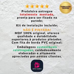 preciso montar É complicado de instalar Não se preocupe As prateleiras já vão montadas e prontas para instalar. Enviamos com buchas e parafusos, então é só fixar na parede. Simples, rápido e sem dor de cabeça. será que é resistente mesmo Sim Fabricadas em MDF 15mm com acabamento melamínico, nossas prateleiras suportam até 8 kg cada com tranquilidade. É qualidade testada e aprovada por centenas de clientes.