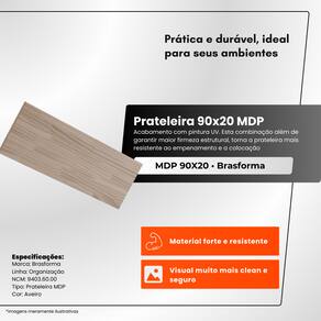 Prateleira MDP 90X20 Aveiro - Organização PAB90X20 UVPrateleira em MDP e acabamento com pintura UV. Esta combinação além de garantir maior firmeza estrutural, torna a prateleira mais resistente ao empenamento e a colocação e remoção de parafusos, além de torná-lo um material mais leve. Design discreto e elegante permite uma fácil instalação, pois já acompanha todos os acessórios para fixação podendo ser instalado em diversos ambientes.Informações Adicionais