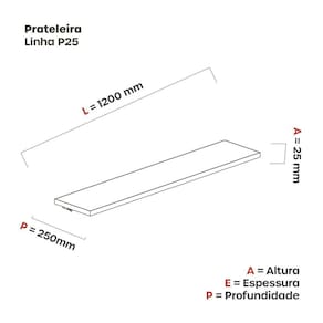Prateleira em MDP 25mm medindo 25mm(A)x1200(L)x250mm(P), móvel funcional, decorativo que cabe em diferentes ambientes e ajuda a organizar uma série de itens além de deixe seu cantinho ainda mais charmoso. Ambiente Principal: Escritório Complexidade da Montagem: Baixa: pode ser montado por uma pessoa sozinha Cor: Grafito Cor do Produto: Grafito Escala de Brilho: Semi-Fosco Itens Inclusos: 1 Prateleira, kit ferragens e manual de montagem Linha ou Coleção: P25 Manual de Montagem e Instalação: https://cdn2.madeiramadeira.com.br/atributo/pandin/875720-11-t125-051-prateleira-600-1200.pdf Material da Prateleira: MDP Material Principal: MDP Necessita Montagem: Sim Origem do Produto: Nacional Peso: 4,85 kg Peso Máximo por Prateleira: 25 kg Possui Espelho: Não Possui Possui Fundo: Não Possui Portas: Não Possui Prateleiras: 01 Possui Toalheiro: Não Recomendações de Uso, Manutenção e Limpeza: Limpeza deve ser feita com um pano levemente umedecido e um pano seco. Sistema de Montagem: Parafuso Tipo de Nicho: Prateleira