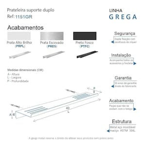 A prateleira suporte duplo da linha Grega possui um design moderno e sofisticado, é uma peça que se destaca com requinte. Ela decora e adiciona personalidade. Podem ser utilizadas em banheiros, decoração de parede, cozinhas, quartos e muito mais. Aproveita o espaço vertical das paredes liberando espaço no chão, assim criando a sensação de um ambiente maior. São peças que fazem realçar qualquer objeto, foi criada Em aço inox com uma qualidade que abrange áreas litorâneas, e possui a de um acabamento muito resistente. Agora é só você adquirir este lindo acessório e fazer o seu projeto se tornar realidade com um banheiro prático para toda a sua família. Características Fabricado em metal aço inox. Disponível no Prata Alto Brilho, Escovado e Preto Fosco. Pode ser instalado em parede, azulejo e porcelanato. Benefícios Fixação prática e segura com parafusos e buchas inclusos. O produto não possui nenhum detalhe em plástico ABS . Fácil higienização, ideal para locais que exigem limpeza constante. Aproveitamento inteligente do espaço, ideal para ambientes compactos. Resistente à corrosão e luz solar. Itens ENVIADOS: 1 prateleira suporte duplo 40cm, kit de parafusos e manual de instrução e instalação. Instalação INTELIGENTE Ao 1º furo, use uma broca medida menor, após use a medida correta e finalize, vai ajudar na precisão da fixação da bucha principalmente em azulejos e porcelanato. Marca: Não Informado Ean: 7908165322896