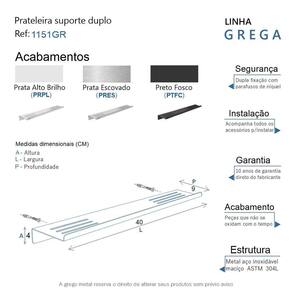 A prateleira suporte duplo da linha Grega possui um design moderno e sofisticado, é uma peça que se destaca com requinte. Ela decora e adiciona personalidade. Podem ser utilizadas em banheiros, decoração de parede, cozinhas, quartos e muito mais. Aproveita o espaço vertical das paredes liberando espaço no chão, assim criando a sensação de um ambiente maior. São peças que fazem realçar qualquer objeto, foi criada Em aço inox com uma qualidade que abrange áreas litorâneas, e possui a de um acabamento muito resistente. Agora é só você adquirir este lindo acessório e fazer o seu projeto se tornar realidade com um banheiro prático para toda a sua família. Características Fabricado em metal aço inox. Disponível no Prata Alto Brilho, Escovado e Preto Fosco. Pode ser instalado em parede, azulejo e porcelanato. Benefícios Fixação prática e segura com parafusos e buchas inclusos. O produto não possui nenhum detalhe em plástico ABS . Fácil higienização, ideal para locais que exigem limpeza constante. Aproveitamento inteligente do espaço, ideal para ambientes compactos. Resistente à corrosão e luz solar. Itens ENVIADOS: 1 prateleira suporte duplo 40cm, kit de parafusos e manual de instrução e instalação. Instalação INTELIGENTE Ao 1º furo, use uma broca medida menor, após use a medida correta e finalize, vai ajudar na precisão da fixação da bucha principalmente em azulejos e porcelanato. Marca: Não Informado Ean: 7908165322926