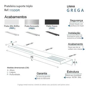A prateleira suporte triplo da linha Grega possui um design moderno e sofisticado, é uma peça que se destaca com requinte. Ela decora e adiciona personalidade. Podem ser utilizadas em banheiros, decoração de parede, cozinhas, quartos e muito mais. Aproveita o espaço vertical das paredes liberando espaço no chão, assim criando a sensação de um ambiente maior. São peças que fazem realçar qualquer objeto, foi criada Em aço inox com uma qualidade que abrange áreas litorâneas, e possui a de um acabamento muito resistente. Agora é só você adquirir este lindo acessório e fazer o seu projeto se tornar realidade com um banheiro prático para toda a sua família. Características Fabricado em metal aço inox. Disponível no Prata Alto Brilho, Escovado e Preto Fosco. Pode ser instalado em parede, azulejo e porcelanato. Benefícios Fixação prática e segura com parafusos e buchas inclusos. O produto não possui nenhum detalhe em plástico ABS . Fácil higienização, ideal para locais que exigem limpeza constante. Aproveitamento inteligente do espaço, ideal para ambientes compactos. Resistente à corrosão e luz solar. Itens ENVIADOS: 1 prateleira suporte triplo 70cm, kit de parafusos e manual instrução instalação. Instalação INTELIGENTE Ao 1º furo, use uma broca medida menor, após use a medida correta e finalize, vai ajudar na precisão da fixação da bucha principalmente em azulejos e porcelanato.