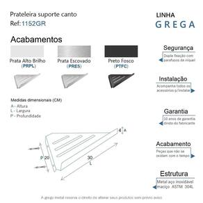 A prateleira suporte canto da linha Grega possui um design moderno e sofisticado, é uma peça que se destaca com requinte. Ela decora e adiciona personalidade. Podem ser utilizadas em banheiros, decoração de parede, cozinhas, quartos e muito mais. Aproveita o espaço vertical das paredes liberando espaço no chão, assim criando a sensação de um ambiente maior. São peças que fazem realçar qualquer objeto, foi criada Em aço inox com uma qualidade que abrange áreas litorâneas, e possui a de um acabamento muito resistente. Agora é só você adquirir este lindo acessório e fazer o seu projeto se tornar realidade com um banheiro prático para toda a sua família. Características Fabricado em metal aço inox. Disponível no Prata Alto Brilho, Escovado e Preto Fosco. Pode ser instalado em parede, azulejo e porcelanato. Benefícios Fixação prática e segura com parafusos e buchas inclusos. O produto não possui nenhum detalhe em plástico ABS . Fácil higienização, ideal para locais que exigem limpeza constante. Aproveitamento inteligente do espaço, ideal para ambientes compactos. Resistente à corrosão e luz solar. Itens ENVIADOS: 1 prateleira suporte canto 30cm, kit de parafusos e manual instrução instalação. Instalação INTELIGENTE Ao 1º furo, use uma broca medida menor, após use a medida correta e finalize, vai ajudar na precisão da fixação da bucha principalmente em azulejos e porcelanato. Marca: Não Informado