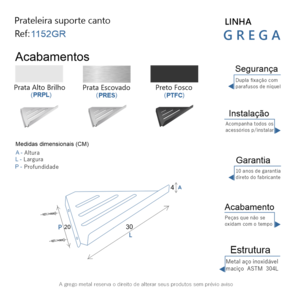 ITENS ENVIADOS: 1 prateleira suporte canto 30cm, kit de parafusos e manual instrução instalação.