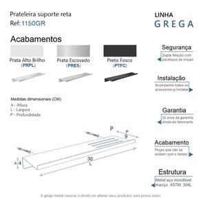 A prateleira suporte reta da linha Grega possui um design moderno e sofisticado, é uma peça que se destaca com requinte. Ela decora e adiciona personalidade. Podem ser utilizadas em banheiros, decoração de parede, cozinhas, quartos e muito mais. Aproveita o espaço vertical das paredes liberando espaço no chão, assim criando a sensação de um ambiente maior. São peças que fazem realçar qualquer objeto, foi criada Em aço inox com uma qualidade que abrange áreas litorâneas, e possui a de um acabamento muito resistente. Agora é só você adquirir este lindo acessório e fazer o seu projeto se tornar realidade com um banheiro prático para toda a sua família. Características Fabricado em metal aço inox. Disponível no Prata Alto Brilho, Escovado e Preto Fosco. Pode ser instalado em parede, azulejo e porcelanato. Benefícios Fixação prática e segura com parafusos e buchas inclusos. O produto não possui nenhum detalhe em plástico ABS . Fácil higienização, ideal para locais que exigem limpeza constante. Aproveitamento inteligente do espaço, ideal para ambientes compactos. Resistente à corrosão e luz solar. Itens ENVIADOS: 1 prateleira suporte reta 30cm, kit de parafusos e manual instrução instalação. Instalação INTELIGENTE Ao 1º furo, use uma broca medida menor, após use a medida correta e finalize, vai ajudar na precisão da fixação da bucha principalmente em azulejos e porcelanato. Marca: Não Informado Ean: 7908165322889