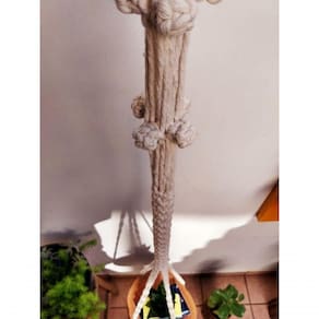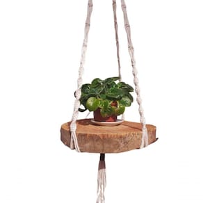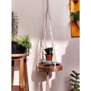 Prateleira suspensa em macramê, com madeira rústica.Modelo: PIPOCAMEDIDAS:Diâmetro da madeira: 30cm.Comprimento do suporte: 2,10m.Por ser natural, formato, cor e espessura da madeira podem variar.A madeira vai tratada e impermeabilizada.