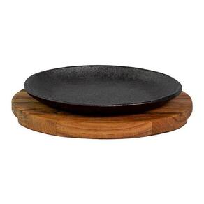 Contém uma prato redondo em ferro fundido de 24 cm, acompanhada de um suporte de madeira.