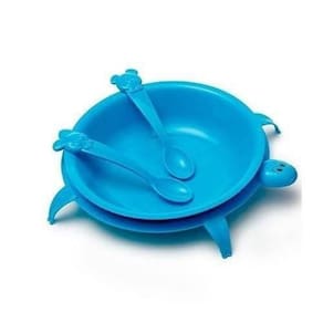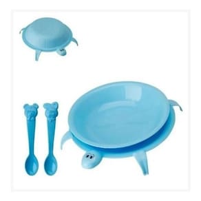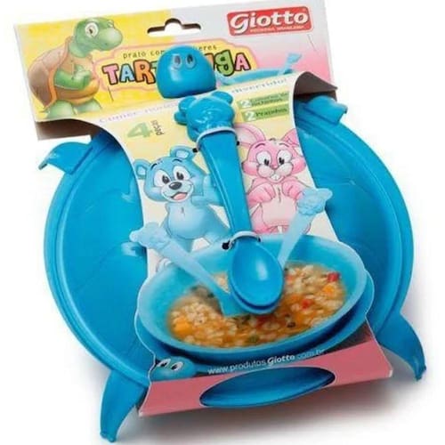 Kit prato tartaruga da marca Giotto, no total são 4 peças sendo elas 2 pratos e 2 colheres, tendo duas cores disponíveis e com um um formato diferenciado que chama a atenção, incentivando as crianças a comerem.