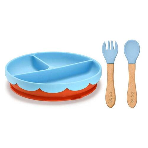 Prato Com Ventosa Yummy Azul E Talheres Silicone Bambu