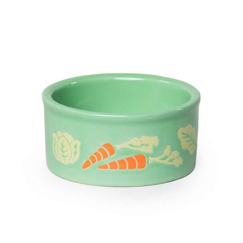 Uma panela de cerâmica resistente com ilustrações coloridas de vegetais contém 8 onças. O prato de cerâmica Prevue Pet apresenta os lados baixos e a ampla abertura que permitem que pequenos animais tenham fácil acesso a alimentos, água ou guloseimas. Projetado para coelhos, furões, porquinhos-da-índia e outros animais pequenos. Disponível em com um padrão vegetal.