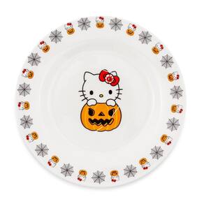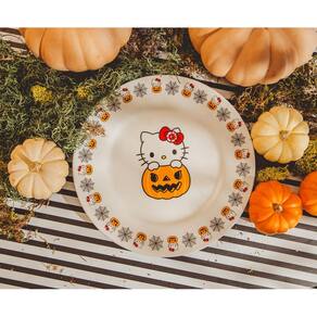 - ESTILO DESTA ESTAÇÃO: Prepare-se para uma surpresa de Halloween ao preparar a mesa com este prato grande. Um banquete assustador espera por você, com a Hello Kitty saindo de uma abóbora e a borda decorada com teias de aranha.