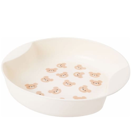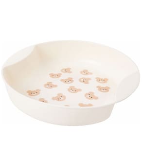 Prato redondo fundo de plástico para alimentação, com pegador nas duas extremidades laterais e decoração predominantemente azul com diversas pequenas silhuetas de urso.
