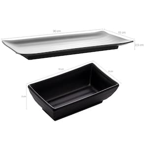 Esse conjunto da linha Tóquio Lyor é perfeito para servir refeições de comida japonesas. O kit formado pelo prato retangular para sushi e pela molheira para shoyu, ambos feitos de melamina, um material super resistente a quedas e muito durável, podendo ir à lava louças, facilitando a limpeza,além de contar com um design oriental inigualável. Servir alimentos orientais em pratos feitos para tal função melhora muito sua experiência como consumidor, dando um toque de sofisticação à sua experiência gastronômica.
