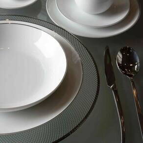 Este Jogo de Prato Fundo em Porcelana Branca, adornado com requintados filetes de ouro Legacy Gold, é uma manifestação de elegância e sofisticação da marca renomada L'Hermitage.