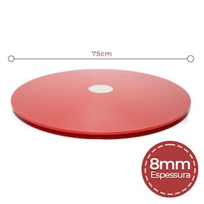 Prato Giratório 75Cm De Vidro Temperado 8Mm Cor Vermelho - vidro temperado 8mm 5 à 7x mais resistente do que o vidro comum; - muito mais resistente à variações de temperatura de até 250ºc panelas etc... - base giratório reforçada e blindada oferece giro livre e macio sem trancos; - prato inferior garante a maior estabilidade 'não tomba'; - qualidade high-premium "foi feito para durar"; - suporta em sua base até 100kg; - corte à laser "sem rebarbas", acabamento perfeito c/borda infinita; - vidro temperado é considerado como "vidro de segurança" não estilhaça ; - sucesso absoluto, quem utiliza aprova e recomenda Atenção Nosso maior compromisso é a qualidade e segurança, fique atento à economizar comprando prato giratório pelo menor preço. Com segurança não se brinca, existem pratos no mercado que estão descolando à mesa, isso pode transformar um momento familiar no maior pesadelo. Muitas vezes o barato sai caro. Exija qualidade para sua total segurança. Dica: decorativo e funcional, pode ser utilizado também como centro de mesa. Dica extra: pode ser utilizado para exposição de produtos em lojas, é ótimo para confeitar bolos. Cuidados: Utilize detergente neutro e enxágue com água em abundância. Para secar utilize pano seco e macio. Utilize esponja macia e não abrasiva. Características: Altura: 2cm Diâmetro: 75cm Espessura do vidro: 8mm Cor: vermelho Material: vidro e rolamento de alumínio Conteúdo: 1 x prato giratório vermelho 75cm