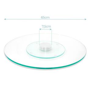Características: Altura: 5cm Diâmetro: 65cm Base giratória: 5cm Espessura do vidro: 8mm Cor: incolor Material: vidro temperado Base giratória inox 304