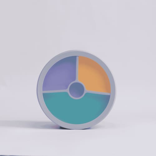 Cor: Base cinza com divisórias nas cores amarelo, roxo e verde
