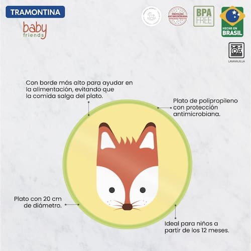 Prato Infantil Tramontina Baby Friends Em Polipropileno Verde Prato Infantil Tramontina Baby Friends em Polipropileno Verde O prato infantil Tramontina Baby Friends em polipropileno verde vai tornar a refeição do seu bebê muito mais colorida e estimular os sentindos dos pequenos durante a refeição. Ele é produzido em polipropileno e conta com borda alta que auxilia durante a alimentação, característica que evita sujeira e desperdícios. Para proporcionar a segurança para seu bebê, ele possui proteção antimicrobiana que inibe o crescimento de fungos e bactérias, proporcionando benefícios em higiene e redução de microorganismos que causam contaminação. É a Tramontina, pensando em toda a sua família!