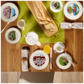 O conjunto contém 1 prato de manteiga de pão naif com design Villeroy & Boch, medindo 17,14 cm, na cor branca com detalhes coloridos.