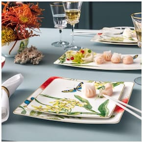 Este prato de café da manhã da Villeroy & Boch apresenta um belo padrão decorado com imagens de orquídeas amarelas, passifloras azuis, beija-flores e borboletas de maracujá, realçado por delicados toques de ouro.