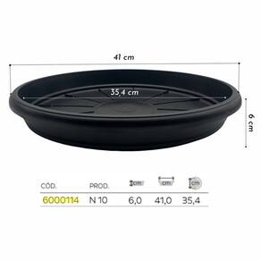 Prato para Vaso Redondo (10) Preto NUTRIPLANDescrição * Este prato redondo foi desenvolvido especialmente para complementar os vasos da linha Jardins. * Com design funcional e elegante, ele oferece suporte ideal para o seu vaso, protegendo superfícies contra sujeira e umidade. Características * Tamanho: N 10 * Altura: 6 cm * Diâmetro Externo (com borda): 41 cm * Diâmetro Interno: 35,4 cm * Material: Produto reciclado * Composição: MP (Material Plástico) * Tipo de Plástico: PP (Polipropileno) Informações/Dicas/Usos * Ideal para os modelos: Vaso Romano Redondo N4, Vaso Terracota Redondo N4, Vaso Comum Redondo N8 Nós da CULTIV.ME trabalhamos desde 2013 para trazer os melhores produtos ao alcance de todos. CULTIV.ME o verde que faltava!