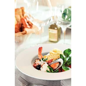 Fettuccine ao molho Alfredo ou espaguete à bolonhesa, seja qual for a escolha, ela fica ainda mais especial com o prato pasta Tramontina Paola em porcelana 27 centímetros de diâmetro. Ele tem inspiração nas cozinheiras e chefs, que profissionalmente ou não, pensam em cada ingrediente com muito carinho e sabem que o amor é sempre o melhor tempero para suas receitas. A porcelana de sua fabricação é tradicional e exclusiva Tramontina, possui excelente brancura, brilho e é translúcida; além de ter alta resistência mecânica e porosidade próxima a zero, que evita a proliferação de fungos e bactérias.