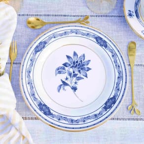 Prato Raso de Cerâmica Feldspática Branca, decorado com um processo de impressão digital que proporciona elegância e sofisticação à peça. Com 29 cm de diâmetro, é ideal para refeições que valorizam a apresentação e o cuidado nos detalhes. O prato apresenta um design clássico em azul, com um contorno dourado que agrega um toque de luxo.