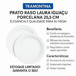 Uma peça coringa para quem deseja unir praticidade e sofisticação. Garanta já o prato raso Tramontina Laura e valorize cada refeição com mais beleza e resistência.