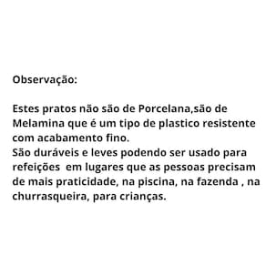 Obsevação: Estes Pratos não são de Porcelana,São de Melamina que é um Tipo de Plastico Resistente com acabamento Fino.São duráveis e leves podendo ser utilizado para refeições e em lugares que as pessoas precisam de mais praticidade, na piscina, na fazenda , na churrasqueira, para crianças.