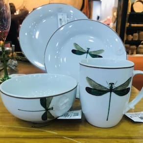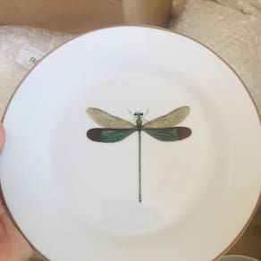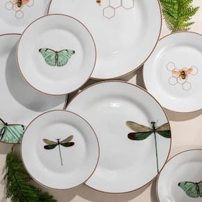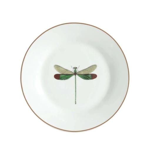 Com um delicado desenho de libélula, este prato de porcelana traz um toque de elegância e sofisticação às suas refeições.