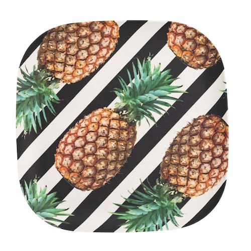 Prato Summer Abacaxi 20x20cm - Oxford Aproveitando as vantagens da fibra de bambu, que são a leveza e a segurança, a oxford dispõe de uma linha ideal para uso em áreas ao ar livre, como piscinas e jardins. São peças perfeitas para confraternizações com a família e amigos nestes locais. A figura do abacaxi é atual e vem tomando conta das estampas há algum tempo. Nessa opção, uma padronagem de listas pretas e brancas como fundo deixa as peças ainda mais contemporâneas. Esses itens são ideais apenas para servir alimentos, não podendo ser utilizados para cortá-los. Os produtos feitos com fibra de bambu não podem ser aquecidos ou levados ao forno micro-ondas. No entanto, podem ser colocados na lava-louças porque a temperatura da água é menor do que a temperatura atingida no micro-ondas.