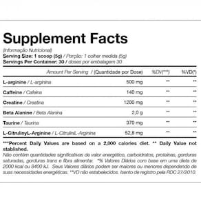 beta alanina, creatina monohidratada, arginina, taurina, cafeína anidra, c. Crispus invernal, acidulante ácido cítrico, aromatizantes, antiumectante dióxido de silício, edulcorante sucralose e corantes artificiais amarelo tartrazina e vermelho 40. Modo de consumo:
