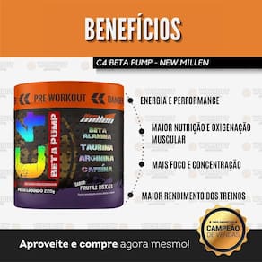 Pré-treino c4 beta pump new millen - 225g Explosão de energia, foco extremo e muito mais intensidade nos treinos O c4 beta pump da new millen é um pré-treino completo, formulado para quem busca energia explosiva, foco mental afiado e resistência muscular máxima. Com uma combinação poderosa de beta-alanina, cafeína e arginina, ele proporciona aquele pump insano, ideal para levar seus treinos a um novo nível principais benefícios: Aumento de energia e disposição imediata Foco e concentração nos treinos Efeito pump muscular Mais força e resistência física Melhora do desempenho durante exercícios intensos Rápida absorção e ação eficaz informações do produto: Marca: new millen Nome: c4 beta pump Peso: 225g Contém cafeína, beta-alanina, taurina e arginina Sabor delicioso e fácil de misturar indicado para: Atletas e praticantes de musculação que desejam melhor desempenho físico, mais força e intensidade nos treinos. Ideal para quem busca aquele estímulo extra antes do treino. como usar: Diluir 1 scoop 5g em 200 ml de água gelada e consumir 30 minutos antes do treino. Não exceder a dose recomendada. Compre com confiança Marca: Não Informado