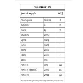 Beta alanina, arginina, taurina, maltodextrina, cafeína, tirosina, fosfato tricalcico, aroma idêntico ao de abacaxi, ácido cítrico, niacina, vitamina b6, vitamina b9, vitamina b12, edulcorante sucralose, corante amarelo 5.